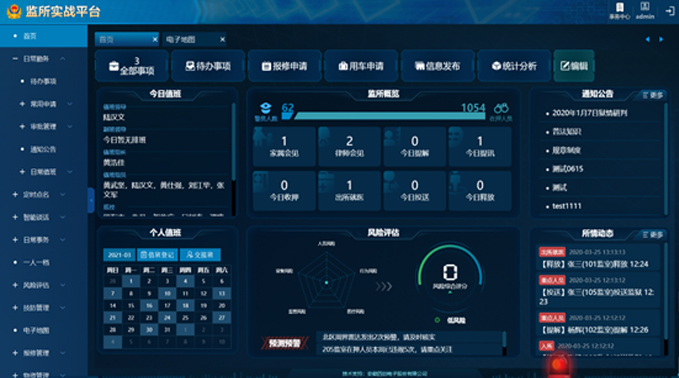 監(jiān)所實戰(zhàn)平臺以監(jiān)所實戰(zhàn)業(yè)務(wù)為導(dǎo)向,以物聯(lián)網(wǎng)、大數(shù)據(jù)為手段,升級、完善、整合安防系統(tǒng)和被監(jiān)管人員信息系統(tǒng),實現(xiàn)監(jiān)所技防管理、動態(tài)信息主導(dǎo)勤務(wù)、風(fēng)險評估、執(zhí)法監(jiān)督四大業(yè)務(wù)功能,旨在提高監(jiān)所風(fēng)險預(yù)警和突發(fā)事件處置能力,是監(jiān)所實戰(zhàn)管理的“大腦中樞”。